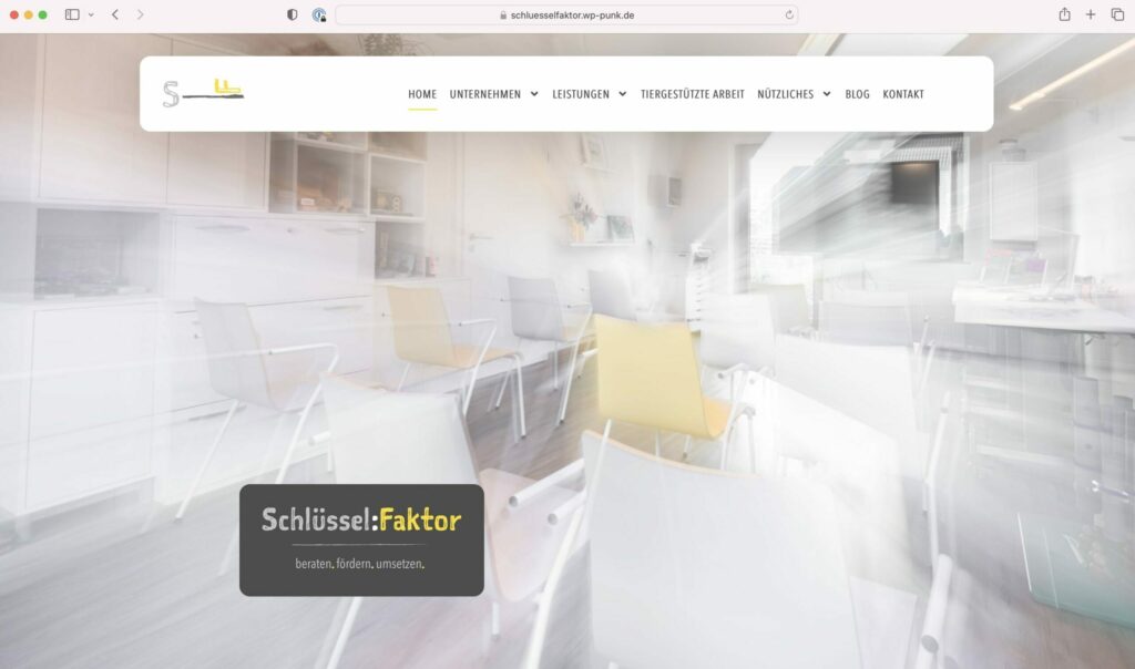 Und damit zukünftige Klient:innen auch vom neuen Angebot erfahren, haben wir zusammen mit Yvette Uphoff eine Website gebaut, die Schlüssel:Faktor entsprechend präsentiert. Das besondere ist die tiergestützte Arbeit mit Hündin „Mala“. Schaut doch mal bei ihr vorbei!